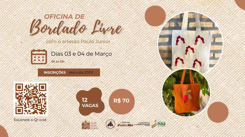 A Superintendência de Desenvolvimento do Artesanato Piauiense (Sudarpi) está com inscrições abertas para a oficina de bordado livre ministrada pelo artesão Paulo Junior, que será realizada no espaço da Casa do Artesão Design Mestre Albertino, em Teresina.