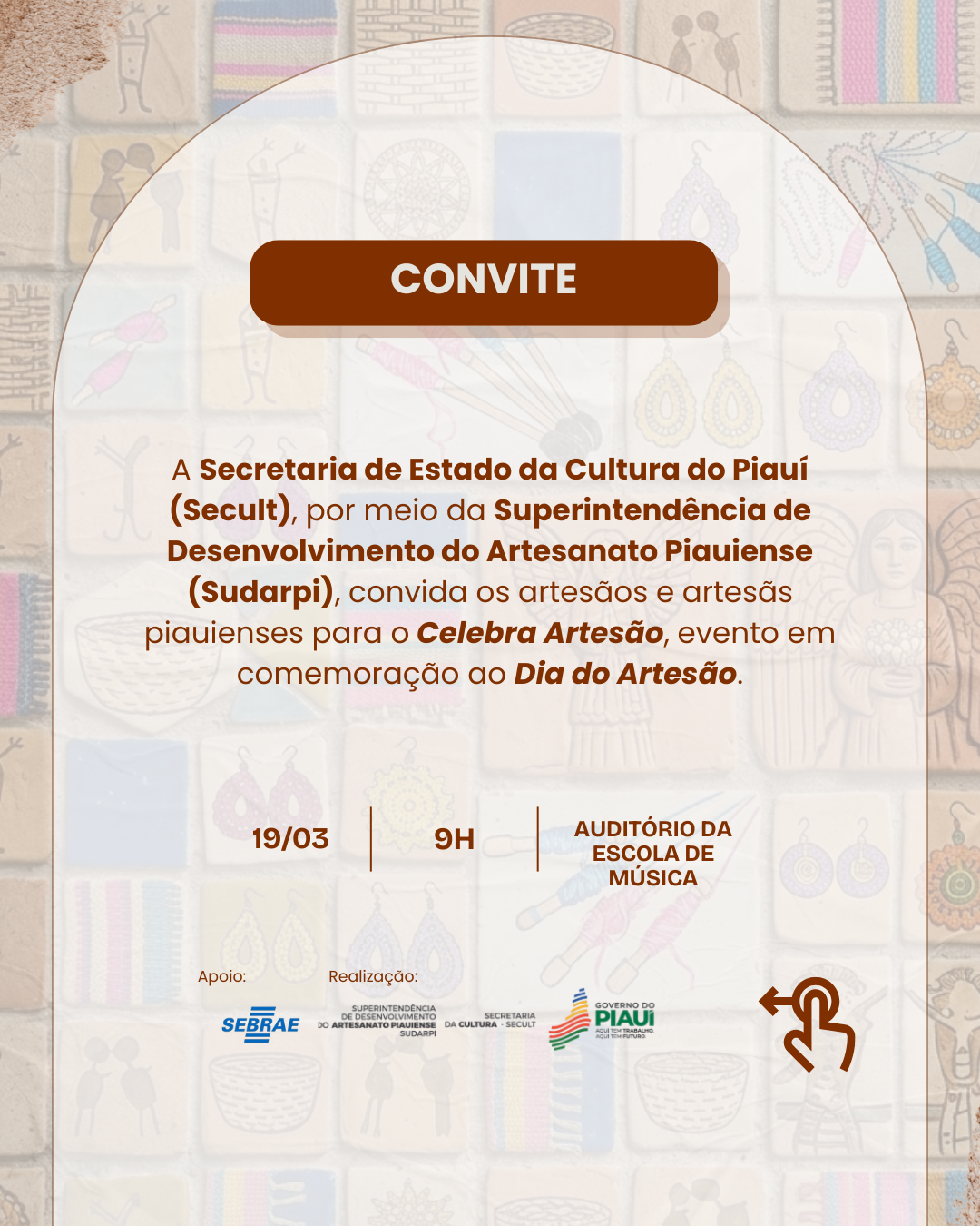 A Secretária do Estado de Cultura (Secult), por meio da Superintendência de Desenvolvimento do Artesanato Piauiense (Sudarpi), realiza nesta quinta-feira (19), o evento “Celebra Artesão”, em alusão ao Dia do Artesão. A programação acontece no Auditório Professor Reginaldo Carvalho, Escola de Música, localizada na Central de Artesanato Mestre Dezinho, no Centro de Teresina.
