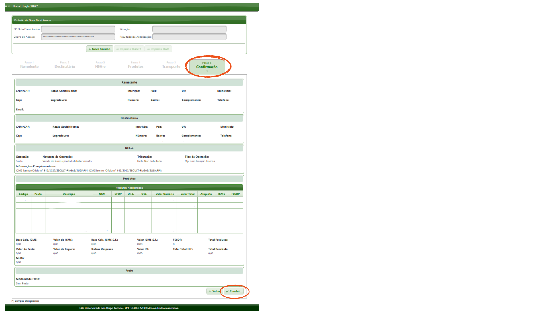 7. Salvar e concluir: verifique as informações e clique em “Concluir”.  O sistema exibirá a mensagem “Nota gravada com sucesso”.
