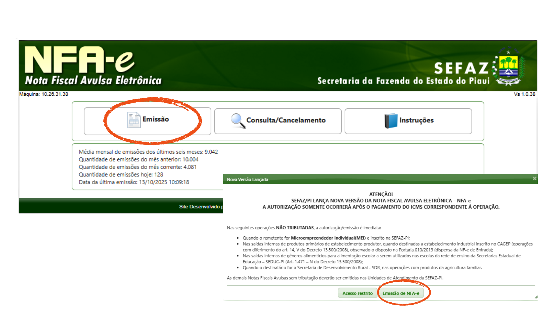 No menu principal, clique em Serviços → SIAT Web → NFA-e → Emissão.