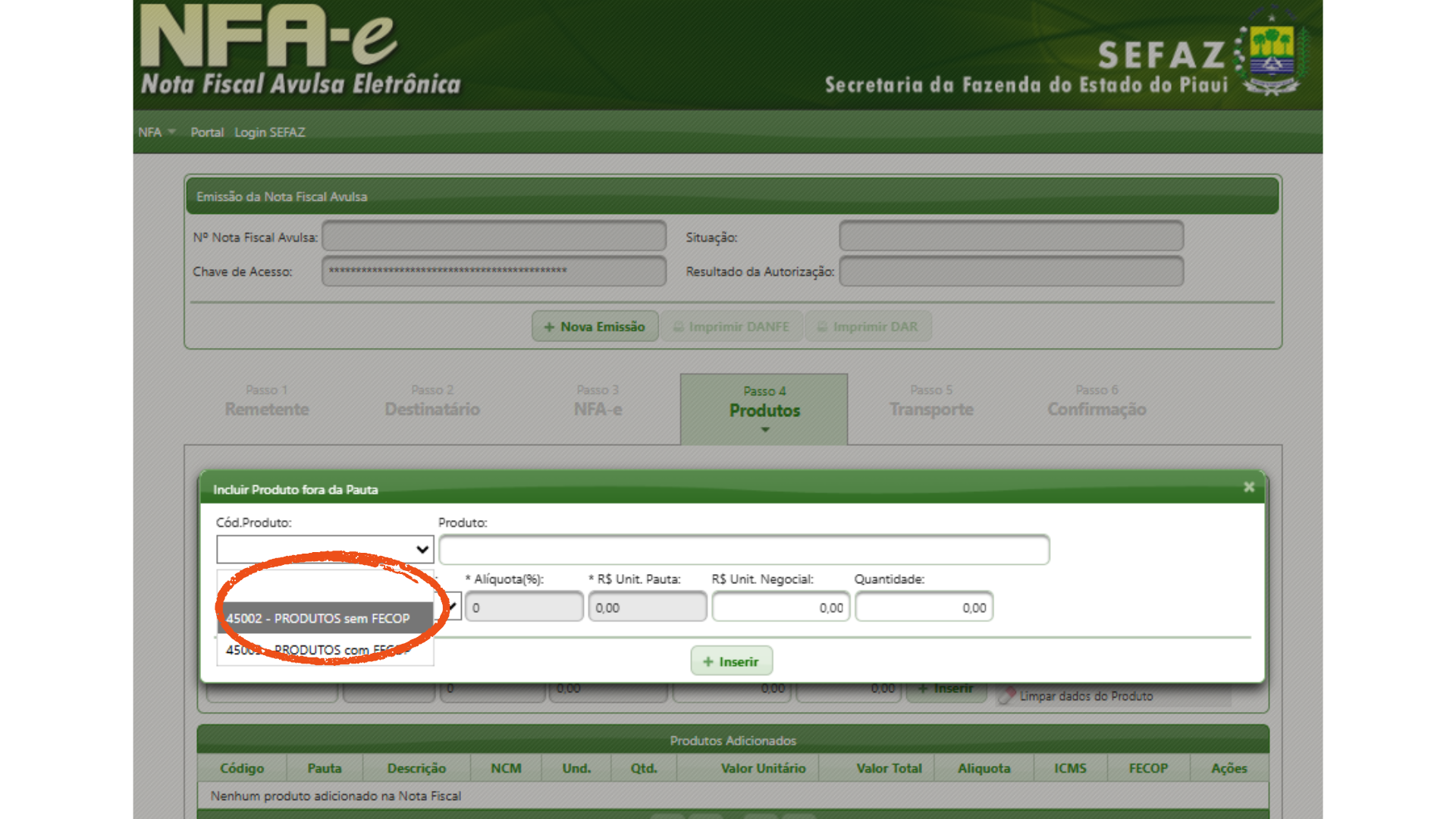 • Inserir o Código do Produto: 45002 – PRODUTOS sem FECOP → Inserir;