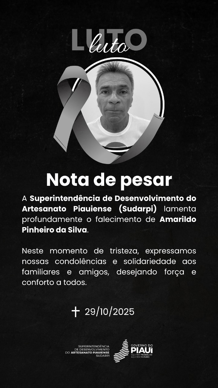 A Superintendência de Desenvolvimento do Artesanato Piauiense (Sudarpi) manifesta seu profundo pesar pelo falecimento de Amarildo Pinheiro da Silva, ex-servidor da instituição.