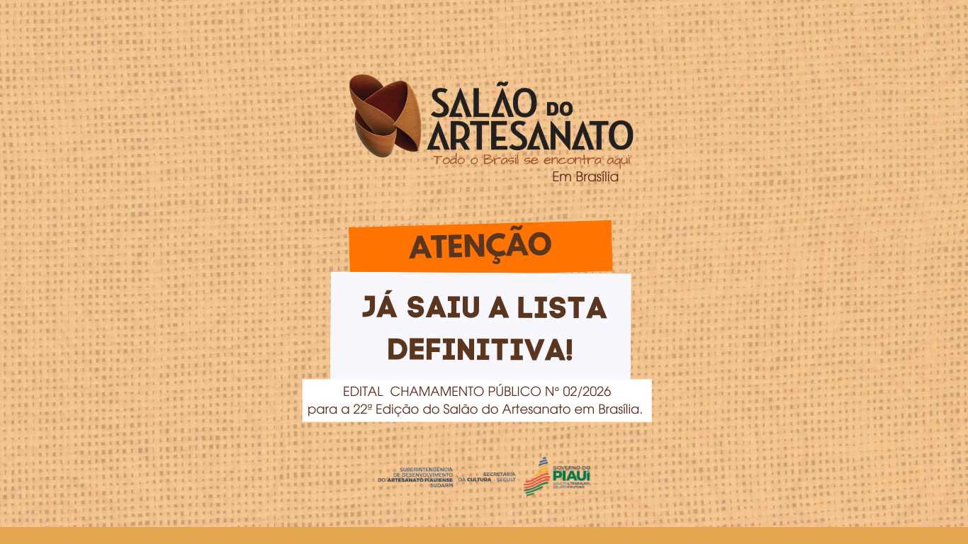 A Secretária de Estado da Cultura (Secult), por meio da Superintendência de Desenvolvimento do Artesanato Piauiense (Sudarpi), torna pública a lista definitiva de artesãos e cooperativas selecionadas para participar do 21º Salão do Artesanato Raízes Brasileira – Brasília.
