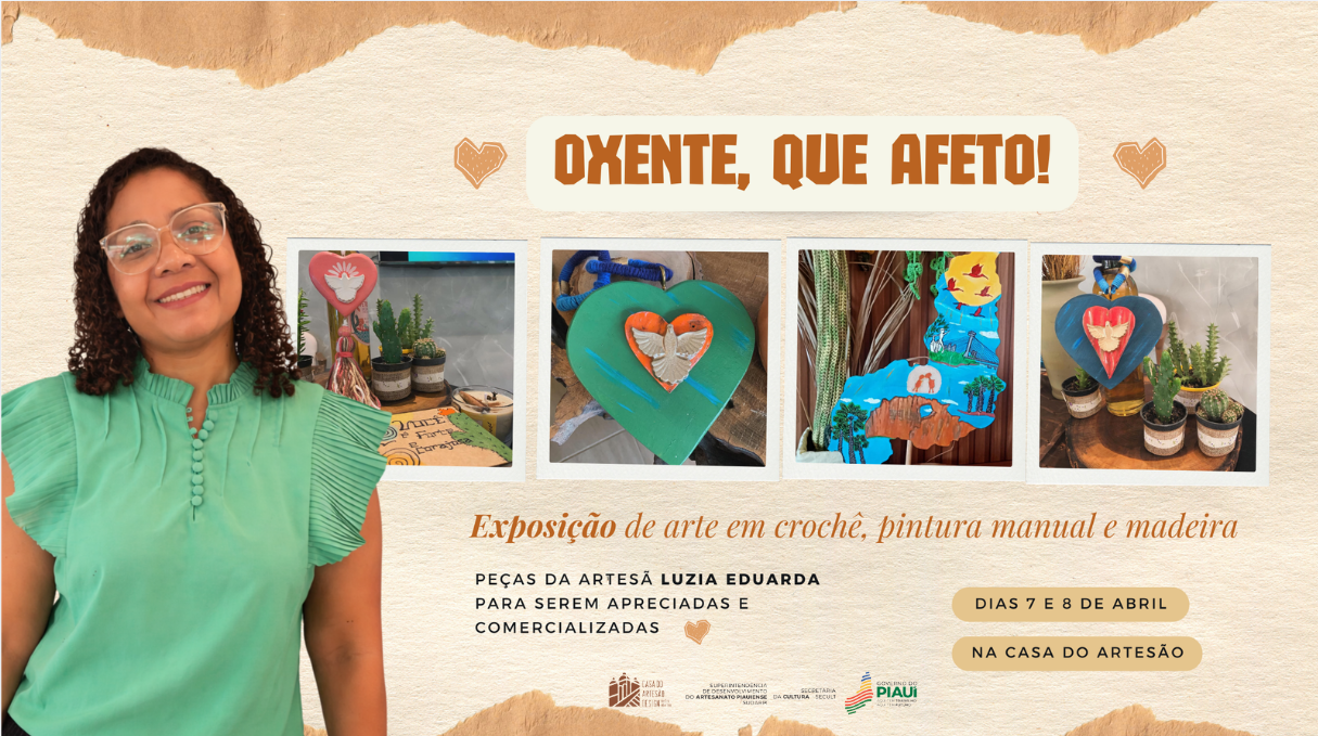 A Mostra da artesã Luzia Eduarda abre ao público com peças autorais que unem afeto, tradição e consciência ambiental. A Casa do Artesão Design Mestre Albertino recebe, a partir desta terça-feira (07), a exposição “Oxente, Que Afeto”, da artesã Luzia Eduarda. A mostra já está aberta ao público na Central de Artesanato Mestre Dezinho e